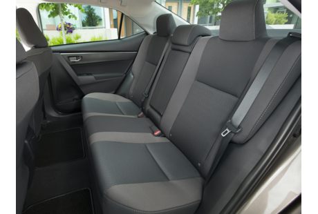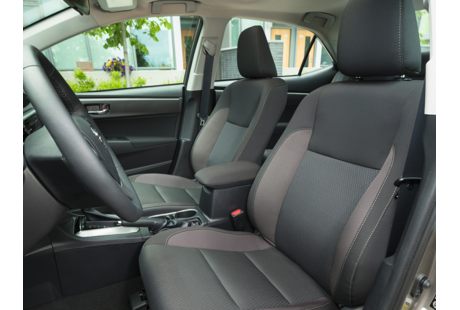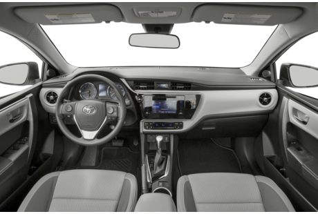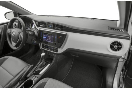 Inside, the Corolla features a standard cloth interior with front bucket seats and a 60/40 split-folding rear seat. The center stack features a standard Entune multimedia system with a new 7-inch touchscreen, Bluetooth connectivity for phone and audio, and a USB port. It can be upgraded with an integrated navigation system, Apple CarPlay/Android Auto, and a premium audio system. Standard features include air conditioning, power windows/locks, and cruise control. Available features include dual-zone automatic climate control, a leather steering wheel, power/heated front seats, a power moonroof, push-button start, and remote keyless entry. The 50th Anniversary Edition has a premium black cloth interior with Black Cherry piping and contrast stitching.